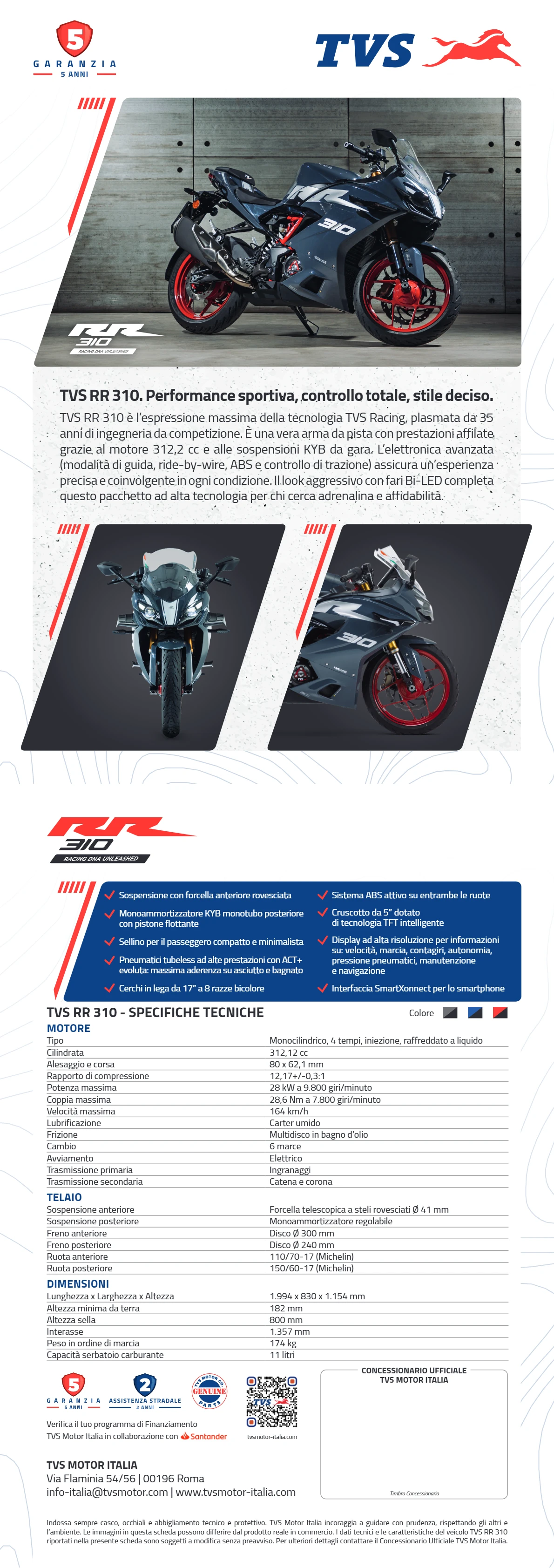 TVS RR 310 ha 5 anni di garanzia ufficiale, valida su tutto il territorio italiano presso i Centri Assistenza Autorizzati.